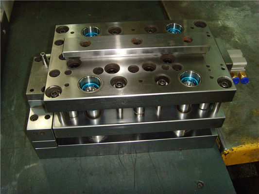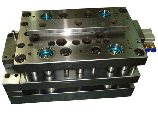 The progressive stamping die is placed into a reciprocating stamping press. As the press moves up, the top die moves with it, which allows the material to feed. When the press moves down, the die closes and performs the stamping operation. With each stroke of the press, a completed part is removed from the die.