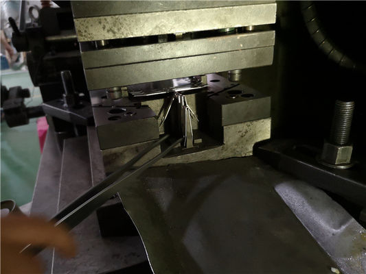 The progressive stamping die is placed into a reciprocating stamping press. As the press moves up, the top die moves with it, which allows the material to feed. When the press moves down, the die closes and performs the stamping operation. With each stroke of the press, a completed part is removed from the die.